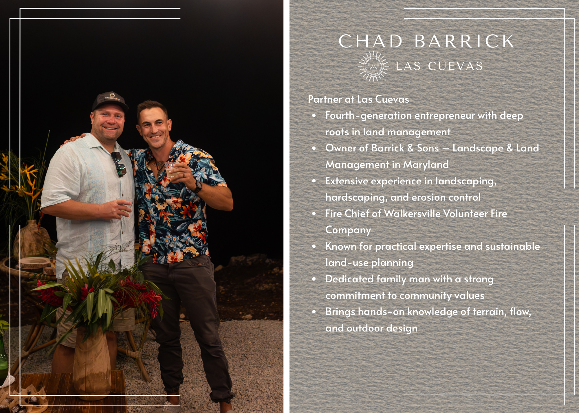 Chad is also a devoted family man whose values are reflected in every decision he makes—from the way he manages teams to the way he thinks about long-term stewardship of the land. His practical know-how and respect for nature make him a perfect fit for a project like Las Cuevas.